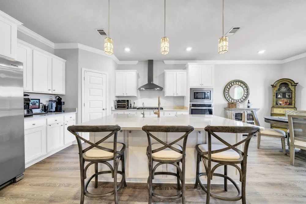 You pull into Lakeview Estates, the gate closing softly behind you, the noise of the day just . . .fades. This is Santa Rosa Beach living the way many people hope to find it - close to everything yet comfortably tucked away. This five-bedroom home is designed for real life. Mornings start easily in the open kitchen, where quartz countertops, generous cabinetry, and plenty of workspace make everything from quick breakfasts to weekend gatherings feel effortless. The kitchen flows naturally into the main living area, so conversations carry, laughter lingers, and no one feels tucked away while hosting. The split floor plan is a quiet win. The primary suite offers a true retreat at the end of the day, while the additional bedrooms flex to fit your life - guest rooms, home offices,